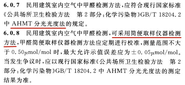 甲醛檢測允許使用經過定期校準的便攜式檢測儀進行檢測,當發生爭議時,應以現行國家標準GB/T18204.2中AHMT分光光度法的測定結果為準。